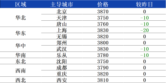 南北价差方面,重点城市乐从3780元、唐山3760元,两地价差20元,邯郸3760元、无锡3820元,两地价差60元左右。