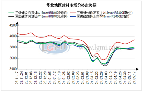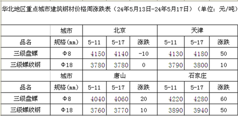 兰格钢铁云商平台监测数据显示,截至5月17日午间,天津市场Φ18mm三级抗震螺纹钢价格为3800元,比上周价格涨10元;北京市场Φ18mm三级抗震螺纹钢价格为3780元,与上周价格持平;唐山市场Φ18mm三级抗震螺纹钢价格为3770元,比上周价格涨10元;石家庄市场Φ18mm三级抗震螺纹钢价格为3940元,比上周价格涨50元。