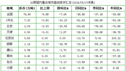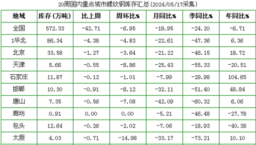 - 国内重点城市螺纹钢库存汇总(05.17)2024/5/17
