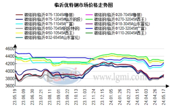 本周临沂优特钢市场价格主稳运行,兰格钢铁云商平台监测数据显示,截至今日,45#碳结钢市场报价:富伦3890元持平,鲁丽3910元稳,钢投3840元较昨上一交易日。