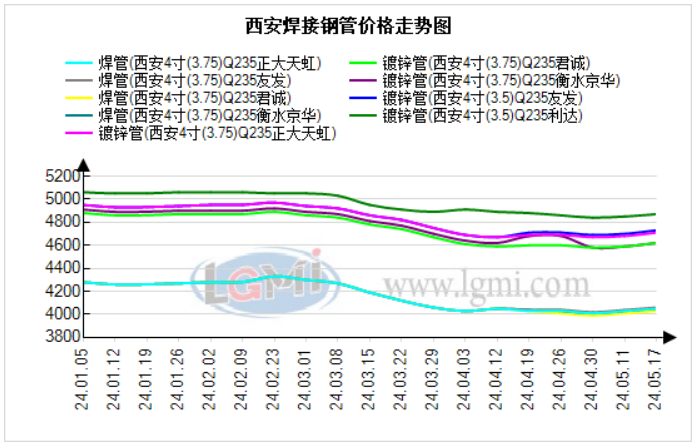 本周西安管材市场价格跟随上游小幅上涨,成交增加。兰格钢铁云商平台监测数据显示,截至2024年5月17日,焊管方面:友发、正大、衡水京华、君诚焊管4寸(3.75mm)价格为4030-4060元,较上周价格上涨40元;镀锌管方面:利达、友发、正大、君诚、衡水京华镀锌管4寸(3.75mm)价格为:4620-4870元,较上周价格持上涨20元。