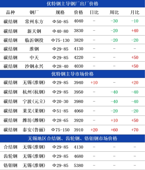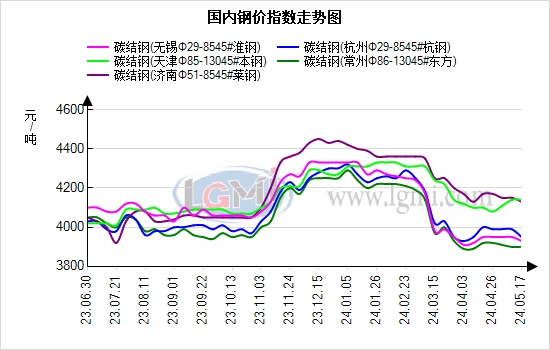 钢厂方面:5月11日衢州元立优特钢出厂价格:1、45#碳结钢Φ20-30mm挂牌价为4140元,维持不变;