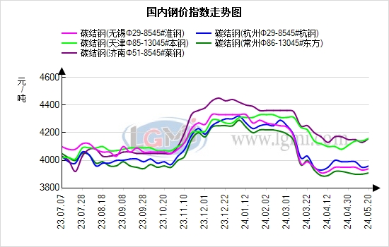 5月20日国内优特钢市场价格持稳运行。据兰格钢铁云商平台监测数据显示,国内重点城市45#碳结钢85mm平均报价4186元/吨,40Cr合结钢85mm平均报价4376元/吨,较上个交易日上涨13元。
