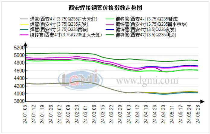 今日西安管材市场价格持小幅下降,黑色系期货下午开盘走弱,成交一般。兰格钢铁云商平台监测数据显示,截至2024年5月28日,焊管方面:友发、正大、衡水京华、君诚焊管4寸(3.75mm)价格为4030-4060元,较上个交易日价格跌10元;镀锌管方面:利达、友发、正大、君诚、水京华镀锌管4寸(3.75mm)价格为:4620-4870元,较上个交易日价格跌10元。