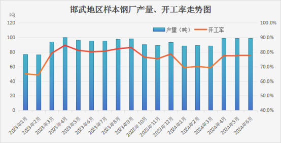 图2 邯郸地区中厚板样本钢厂产量及开工率走势图