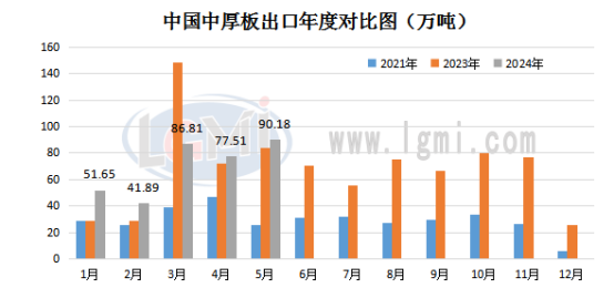 据海关统计数据显示,5月份中厚板出口量为90.18万吨,环比4月份增加约12.67万吨,2024年前5个月中厚板出口总量为348.04万吨,同比2023年减少15.22万吨。近期国内供需压力较大,但国际市场对于国内钢材产品依赖性较前期有所加重,从3月份开始,中厚板品种出口量维持较高水平,对于缓解国内供需压力起到一定作用,虽不及往年同期,但当前市场仍有出口预期释放,后期若无其他因素影响,中厚板产品出口将保持在良好区间。