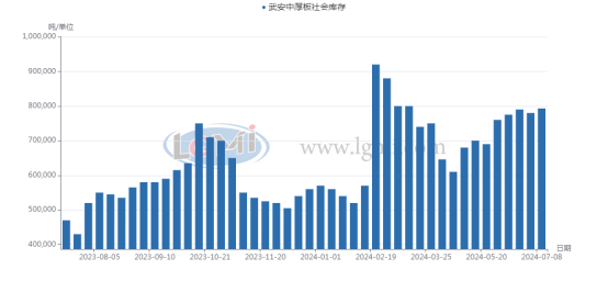 至于库存情况,截止7月8日,根据武安地区40个主流仓库统计数据来看,武安地区中厚板社会库存量为79.3万吨,环比7月1日数据小幅增加1.3万吨左右,同比2023年大幅增加36.3万吨,增幅184.4个百分点,当前库存量相比2月份年内峰值下降12.7万吨。从下图中可见,2024年上半年武安地区社会库存量呈现“V形”走势,由2月份峰值降至4月份谷值,主要是因上半年第一季度国内各项重磅利好政策陆续出台,有效带动上下游产业链需求小幅复苏,在利好数据支撑下,库存水平呈现稳步下降趋势。但随着上游钢厂大规模增进排产意愿,下游行业供求格局失衡,库存水平自第二季度开始,再次呈现垒库态势。