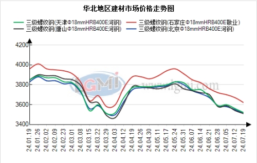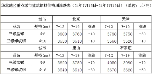 兰格钢铁云商平台监测数据显示,截至7月19日午间,天津市场Φ18mm三级抗震螺纹钢价格为3520元,比上周同期价格跌40元;北京市场Φ18mm三级抗震螺纹钢价格为3510元,比上周同期价格跌40元;唐山市场Φ18mm三级抗震螺纹钢价格为3510元,比上周同期价格跌30元;石家庄市场Φ18mm三级抗震螺纹钢价格为3620元,比上周同期价格跌50元。