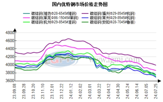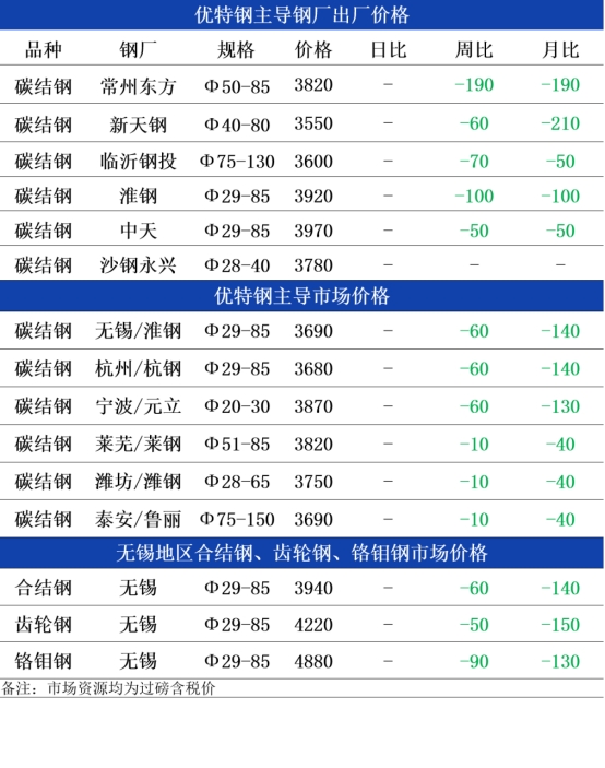 钢厂方面:衢州元立7月下旬优特钢出厂价格碳合钢、工业普圆下调50元、齿轮钢、轴承钢价格维持不动。现45#碳结钢出厂3880元,40cr合结钢出厂4100元,Q235普圆出厂3840元20CrMnTi齿轮钢出厂5860元。