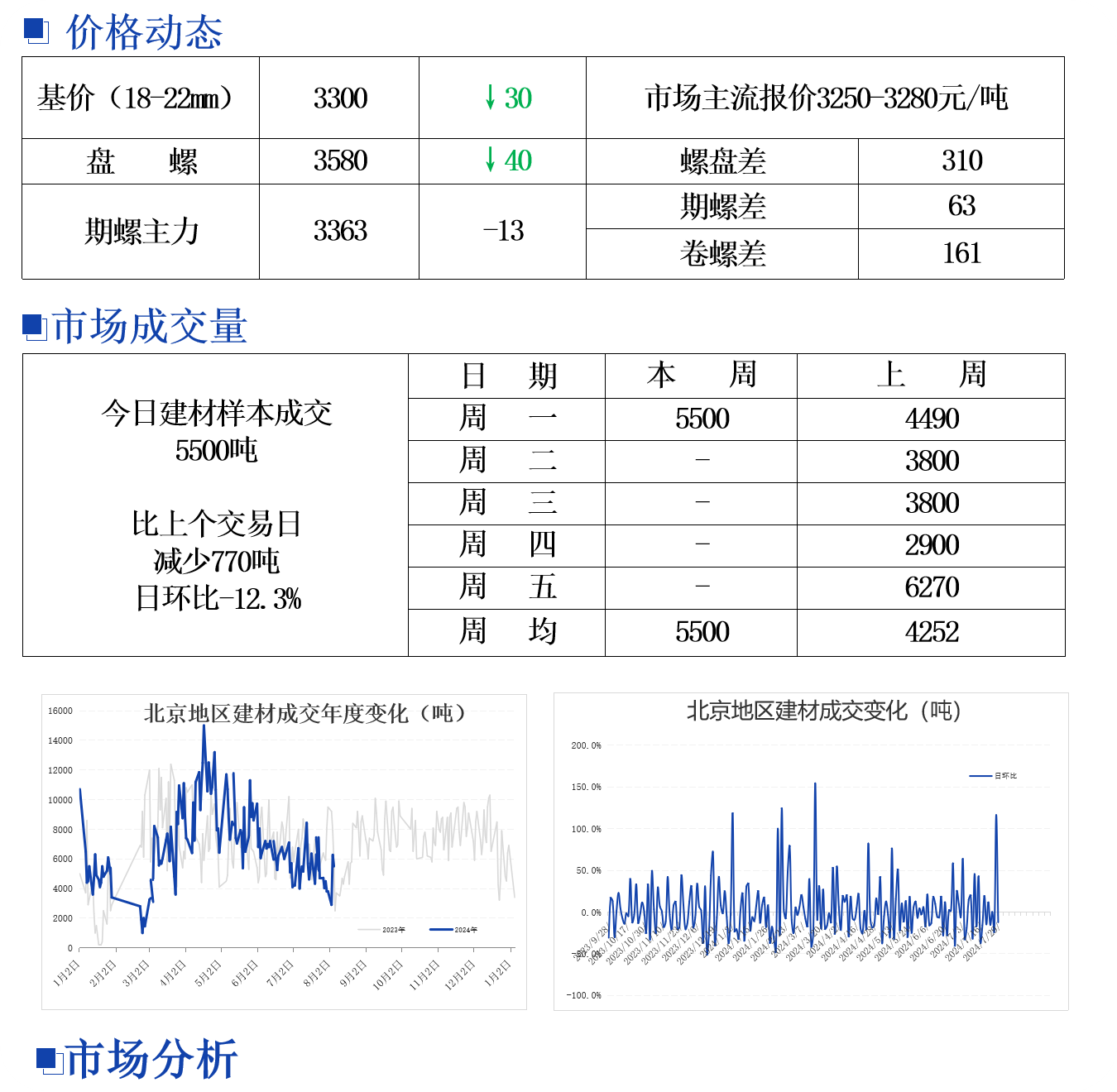 今日期货低位窄幅震荡运行,但随着空头陆续减仓,期货市场恐慌情绪有所好转。北京建筑钢材市场成交较上个工作日减少;从价格方面来看,主流品种的成交价格小幅回落30元,河钢敬业的螺纹钢成交价格在3250-3280元。需求方面,期货低位震荡运行,但现货价格随着周末报价小幅回落10元,一直到中午终端谨慎采购,询单不多,成交一般。午后期螺震荡偏强,贸易商多数为快速出货再次下调出货价,现货价格再回落20元,终端采购量增加,下午成交略有好,但今日成交较上个工作日小幅减少。据兰格钢铁网统计,截至发稿前,北京地区10家大户日成交量约5500吨,较上个工作日减少770吨。综合来看,期螺震荡运行为主,,市场成交心态有所恢复,终端采购较谨慎刚需为主,贸易商随行就市出货,预计明日北京建筑钢材市场价格或将弱稳。