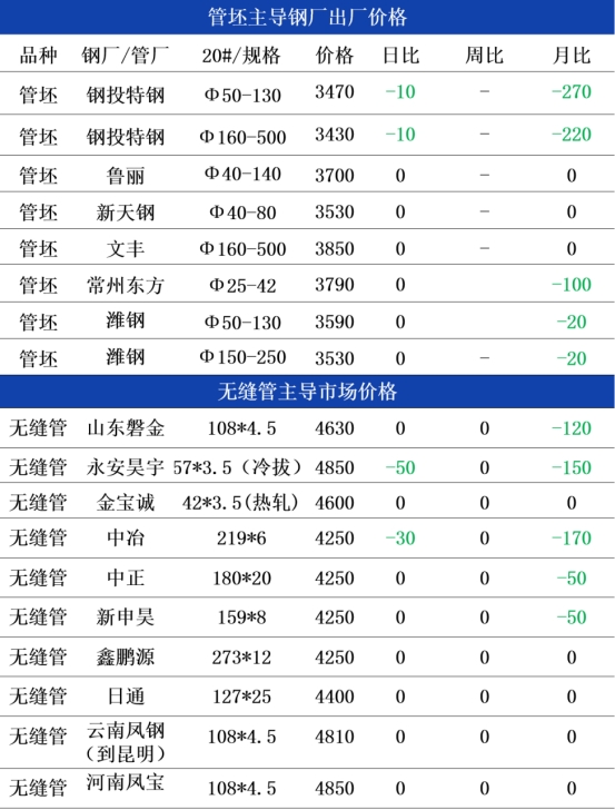 今晨钢厂管坯出厂报价持稳,,昨日全国地区管坯小幅下跌20-30元,今晨期货盘面高开低走加重了市场悲观情绪,近两日多地暴雨来袭导致商家出货不畅,多数商家对于七月份的预期偏空,钢厂挺价略显乏力,预计今天管坯价格小幅下跌。