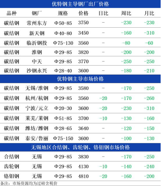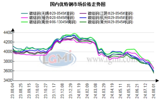 钢厂方面:1日,淮钢8月上旬出厂: 优特钢出厂价格碳合钢、管坯、齿轮、铬铂钢下调100元。现29-85mm45#碳结钢出厂3820元,40cr合结钢出厂4050元,20#管坏出厂3800元。以上调价均为含税价格,即8月1日起开始执行。