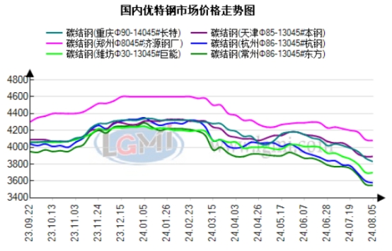钢厂方面:目前山东地区主流钢厂报价3560-3690元。华东地区主流报价3770-3820元。华中地区郑州济源钢铁主流规格报价4260元。华北地区天津钢铁主流规格报价3450元。因需求端反弹困难,钢企端操作依旧谨慎,部分钢企发布减产计划:8月份山东鲁丽钢厂优特钢棒材暂停生产,影响优特钢产量约2.5万吨。供应略有收窄迹象。