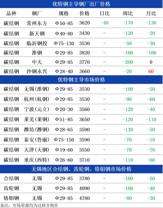 市场方面:昨日黑色系期螺破位下行,市场交投氛围冷清。特钢产量下降速度稍缓慢,需求端特钢表观消费持续性弱势,市场依旧处于传统淡季,短期消费反弹诉求略显乏力。现货交投主要集中在紧缺刚需资源,高价资源仍然接受度差。商家主以销售回笼资金为主。昨日市场走弱,成交低迷,华东地区多数贸易商库存压力相对不大,因此对市场保持谨慎,为促成销售部分采取一单一议;华中、华北地区成交清淡,小幅累库。综合来看,预计今日国内优特钢市场价格小幅趋弱运行。