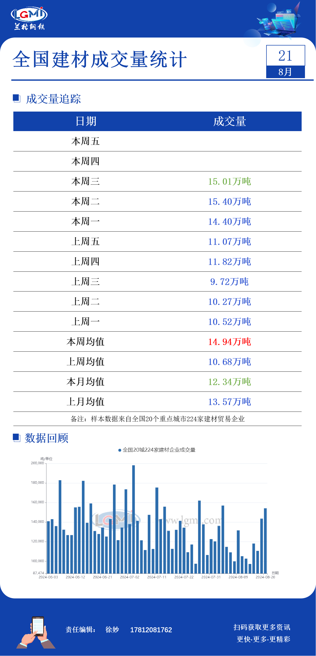 - 8月19日全国建材成交量大幅增加2024/8/19