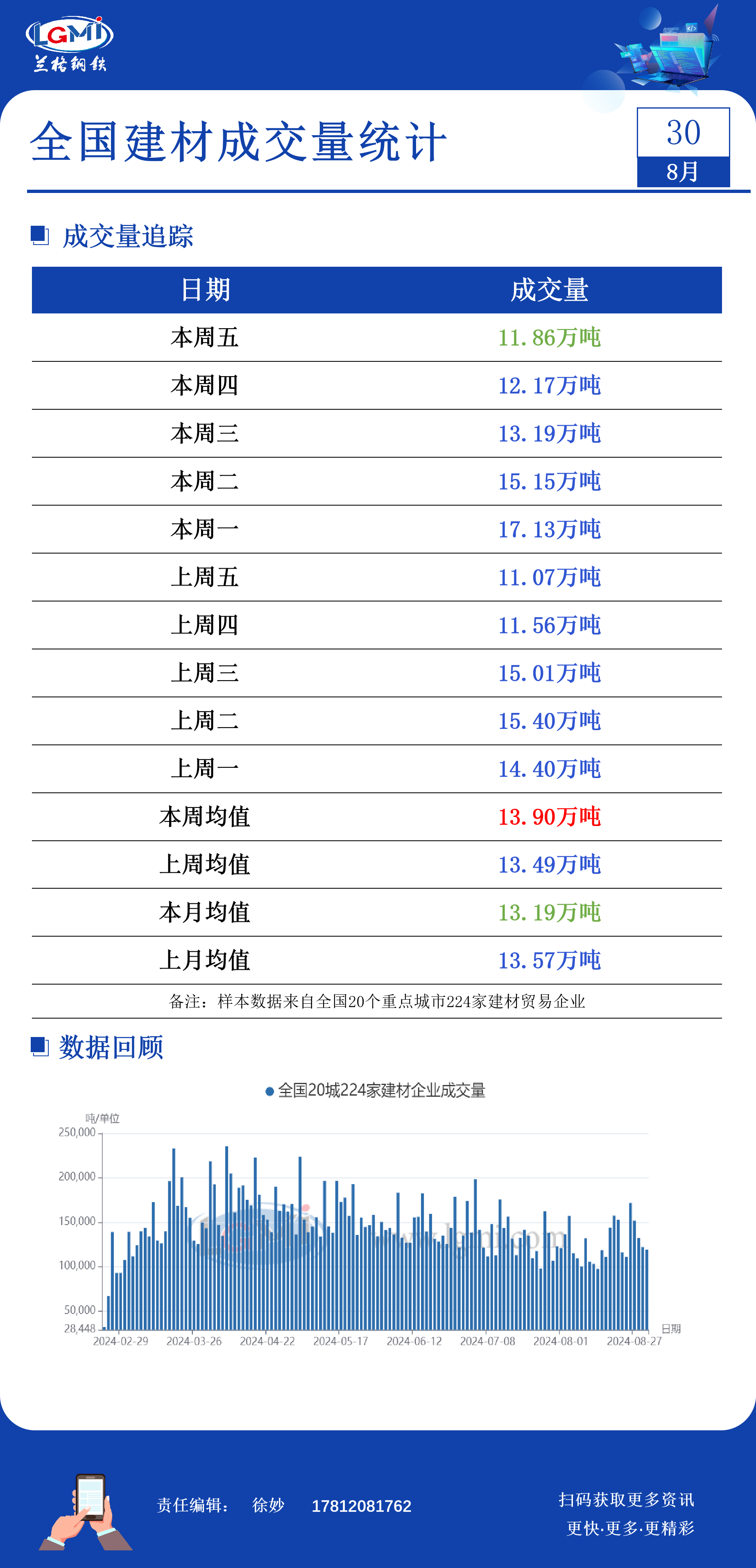 - 8月30日全国建材成交量小幅减少2024/8/30