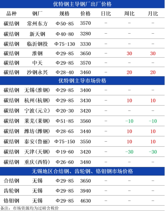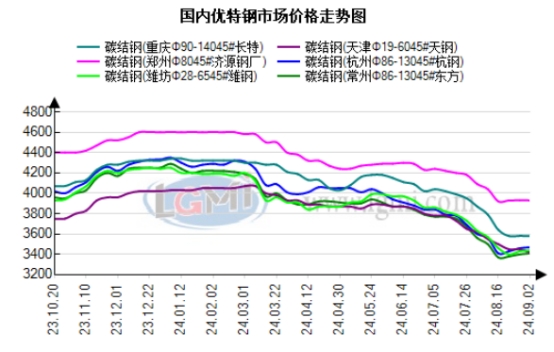 钢厂方面:衢州元立9月上旬优特钢出厂价格碳合钢、工业普圆上调50元,现45#碳结钢出厂3600元;线材、带钢产品均上调50元,以上调价即9月1日开始执行;淮钢9月上旬出厂: 优特钢出厂价格碳合结上调30元、管坏上调40元。现29-85mm45#碳结钢出厂3650元,40cr合结钢出厂3880元,20#管坏出厂3590元。以上调价均为含税价格,即9月1日起开始执行。依照目前的市场大环境来看,今年旺季需求反弹高度将不及往年,受房地产掣肘上升空间有限。但钢厂对旺季仍抱有预期,部分钢厂价格小幅探涨,以此来小幅恢复钢厂利润。