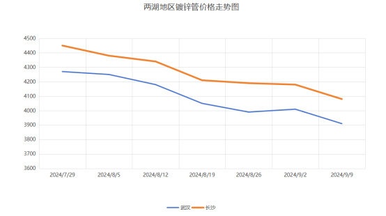 9 月 9 日,武汉地区 4 寸(3.75mm)镀锌管均价为 3910 元 / 吨,较上个交易日降 70 元;长沙地区 4 寸(3.75mm)镀锌管均价为 4080 元 / 吨,较上日降 40 元。目前武汉与长沙两地的差价为 170 元。