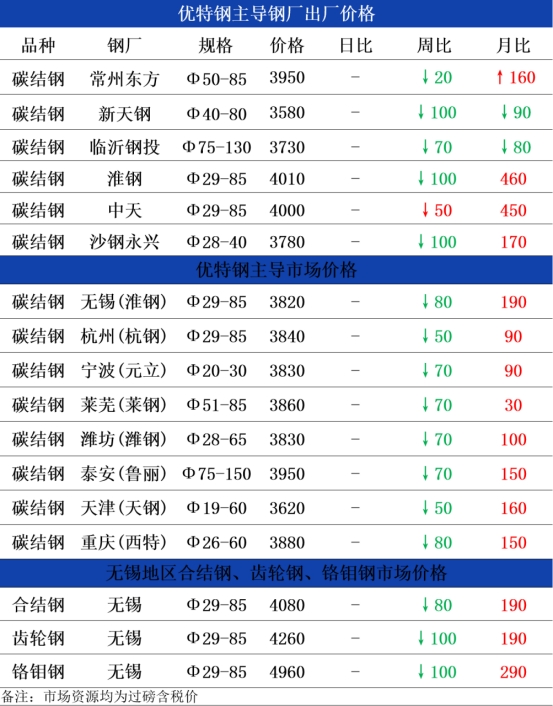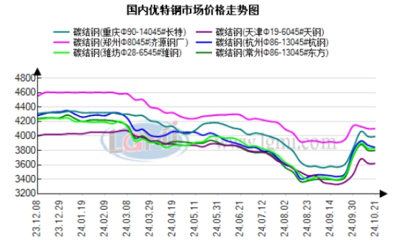 钢厂方面:中天钢铁10月下旬优特钢出厂价格碳合结、管坯下调50元。现Φ40-89mm20#管坯出厂3930元,45#碳结钢出厂4000元。以上价格均为含税价格,10月21日起执行;21日,淮钢10月下旬出厂: 优特钢出厂价格碳合结、管坏下调100元。现29-85mm45#碳结钢出厂4010元,40cr合结钢出厂4240元,20#管坯出厂3960元。以上调价均为含税价格即10月21日起开始执行;21日,沙钢永兴10月下旬优特钢出厂价格下调100元。现45#碳结钢Φ20-50mm出厂3780元,40Cr结构钢Φ20-50mm出厂3980元,以上均为含税价格,以上调价即10月21日起开始执行。昨日部分主流优特钢厂发布旬价政策,由此来看,前期厂内库存小幅累积导致钢厂为去库下调出厂价格。目前基本面供需依旧错配,供应不断攀升,需求端跟进不足,多数钢厂选择出货去库为主。