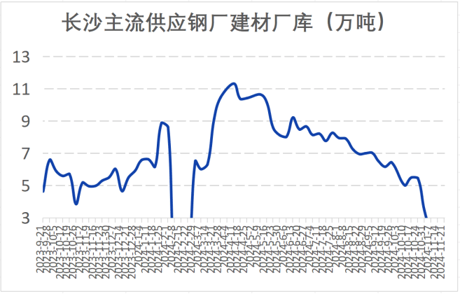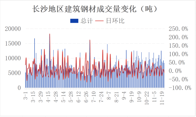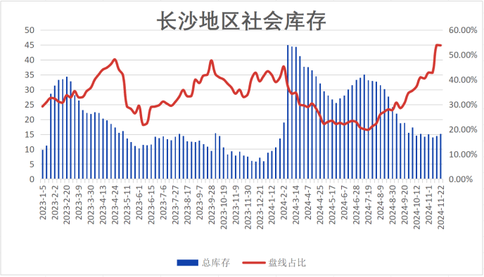 库存方面,长沙建材社会库存环比小幅增加,截止11月22日,长沙建材社会库存为15.217万吨,较上周同期增加0.77万吨,其中螺纹钢8.187万吨,盘线7.03万吨,盘线占比46.20%。