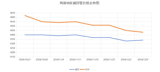 12月 9日,武汉地区 4 寸(3.75mm)镀锌管均价为 4340元 / 吨,价格稳;长沙地区 4 寸(3.75mm)镀锌管均价为 4430元 / 吨,价格稳。目前两湖价差保持90元。