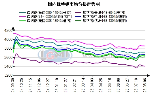 6日国内优特钢市场价格小幅偏强运行,据兰格钢铁云商平台监测数据显示,国内重点城市45#碳结钢85mm平均报价3669元,较上一交易日上涨7元;40Cr合结钢85mm平均报价3834元,较上一交易日上涨7元。主要主导城市价格如下:Φ80-130mm45#杭州3610元;常州3550元;重庆3720元;天津3420元,以上主导城市较上一交易日上涨10-20元。