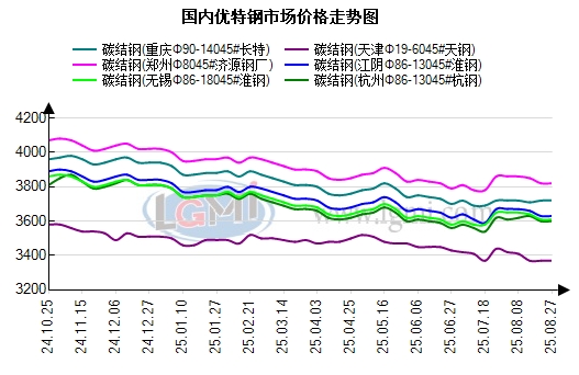 27日国内优特钢市场价格主稳运行,据兰格钢铁云商平台监测数据显示,国内重点城市45#碳结钢85mm平均报价3635元,较上一交易日下跌1元;40Cr合结钢85mm平均报价3800元,较上一交易日下跌1元。主要主导城市价格如下:Φ80-130mm45#杭州3600元;常州3510元;重庆3750元;天津3370元,以上主导城市较上一交易日持稳。