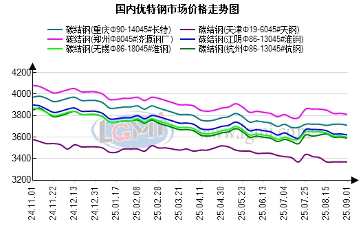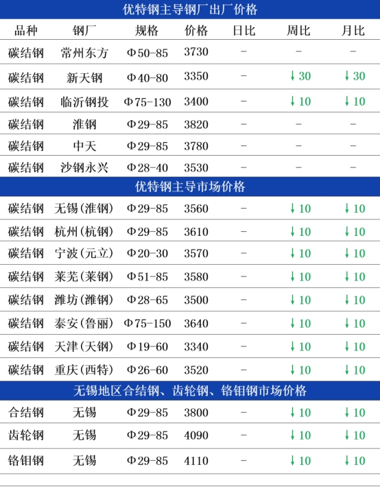 市场方面:昨日原料端盘中虽有震荡,但仍就以绿收市,打击优特钢市场对旺季开市的信心。现货方面,分地区来看,昨华东地区早间优特钢市场以小幅趋弱开市,随着弱势的原料盘面带动,部分商家借势加大优惠抢出货,部分则窄幅调整转观望,到了午后,部分地区出现了二次调整,跌声逐渐增强,不过也还是有商家缓调同时仍主接单,但高位报价明显减少。目前从锡杭等地了解,碳合结钢资源主流报价小幅下行10-20元,部分稀缺规格可保持坚挺,轴承钢、铬钼钢资源主流亦是如此处于跌势,部分手握采购单的商家也再起观望心态。华北、华中地区优特钢市场小幅下跌10-30元,其中碳合结钢资源主流报价走弱,轴承钢、齿轮钢资源也相继走弱以促成交,之前坚挺的操作相对减少,但优惠过后买卖上依日受到考验。综上,原料绿盘且优特钢市场内的平淡交投为引来月初开门红,量价都有些许低位靠拢反馈,流通缓跟免不了谨慎,短时优特钢行情仍会伺机观望后有所动作,灵活应变。