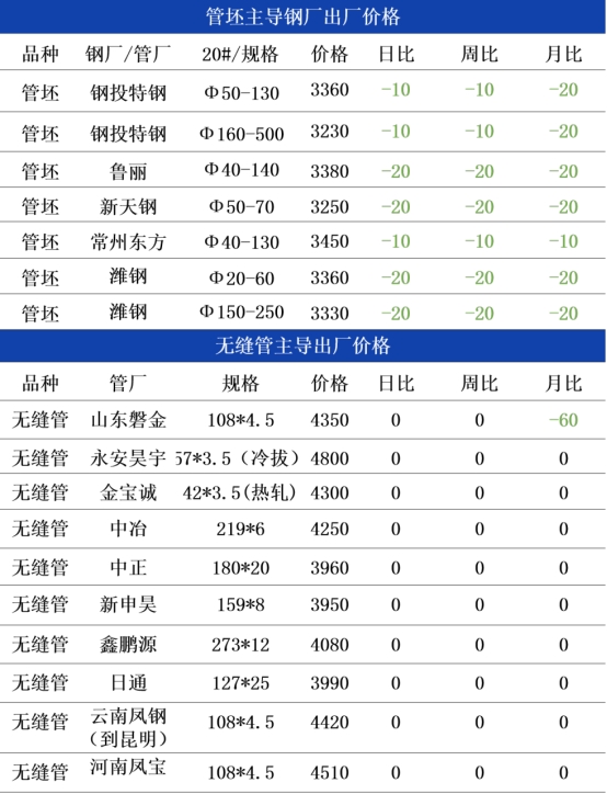 管坯:昨日南北管坯价格均出现小幅回落,山东地区管坯下调10-20元,江苏地区管坯下调20-30元,黑色系期货延续走弱,加剧市场看空情绪,货市场需求不及预期导致信心不足,市场低价甩货现象严重。期货盘面不断下探,使得管坯市场出现大面积倒挂甩货,钢厂接单价格也快速下移,目前市场商家去库意愿较强,下游需求暂未有明显改善,加之暂无明显宏观利好消息,现货价格上涨动力不足,预计今日管坯价格偏弱调整运行。