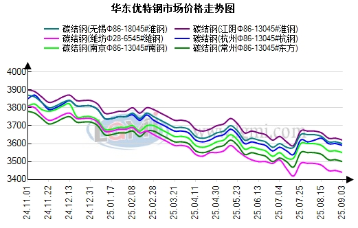 9月3日,华东地区优特钢市场主稳运行。据兰格钢铁云商平台监测数据显示,华东地区主要主导城市价格如下:Φ80-130mm45#碳结钢杭州杭钢价格3590元,无锡淮钢价格3600元,南京南钢3550元;Φ80-130mm40cr合结钢杭州杭钢价格3790元,无锡淮钢价格3800元,南京南钢3750元,市场价格均较上一交易日持稳,以上均为过磅含税价格。