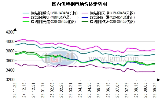 钢厂方面:今日常州东方优特钢出厂价格持稳运行,现45#碳结钢出厂3650元;杭钢优特钢日定价圆钢价格持稳运行,现45#碳结钢出厂3570元,以上均为含税价格;临沂钢投优特钢出厂价格持稳运行,现45#碳结钢出厂3480元;天钢优特钢出厂价格上调10元,现45#碳结钢出厂3370元。今日黑色系期货走势偏好,加之马上迎来国庆小长假,下游有拿货需求,今日部分优特钢企端趁势小幅上调出厂价格。
