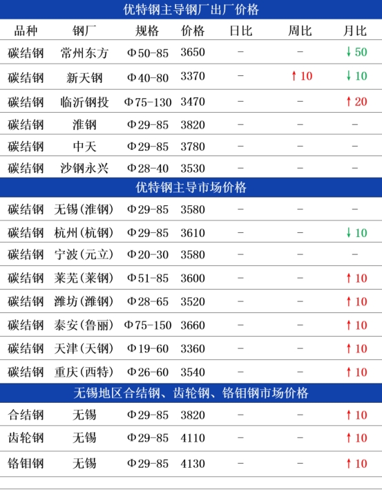 市场方面:昨日黑色系期货普红收市,提振优特钢市场信心,关注今日能否保持红势目扩大涨幅。现货方面,分地区来看,华东地区昨日早间优特钢市场主流资源报价多平稳,但场内积极吆喝出货声音颇多,然采购们淡定观望,暂未有节前强烈的备货意愿释放,到了午后,整体还是企稳为主,部分报价窄幅调整销售,亦有不少报保持不动。目前从锡杭等地了解,碳合结钢资源主流报价主稳,多地还是围绕报价附近吆喝出货,部分规格小幅调整10-20元出货,而轴承钢、铬钼钢资源主流维持平稳,如今规格间价差缩小,主要得益于资源有缺的支撑,当地优特钢价更易抗跌,价格也逐步会有修正的空间。华北、华中地区优特钢市场高位企稳,整体无明显波动,其中碳合结钢资源主流报价主稳,部分地区跟盘小幅上行10元,轴承钢、模具钢资源价格坚挺,除少数特价叫卖,整体持稳观望。综上,虽国庆小长假前夕,但买卖上暂未有理想交投出现,实单流通欠佳,优特钢各方商家依旧会灵活调整为主,顺势操作。