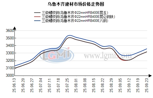 根据兰格钢铁云商平台监测数据显示,以乌鲁木齐为例,截至2025年9月23日,乌鲁木齐建材市场HRB400EΦ22mm螺纹钢八钢3360元,昆仑钢铁3320元,昆玉3320元,闽新3320元,大安3290元,新安特3310元,和钢3290元,较上个交易日持平;HPB300Φ8-10mm高线八钢3510元,较上个交易日持平;HRB400EΦ8-10mm三级盘螺八钢3560元,较上个交易日持平。