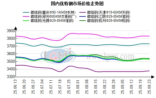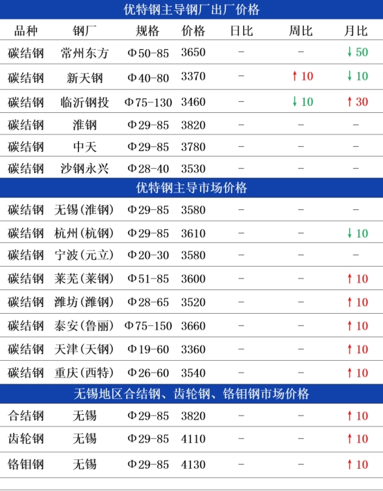 钢厂方面:今日常州东方优特钢出厂价格持稳运行,现45#碳结钢出厂3650元;杭钢优特钢日定价圆钢价格持稳运行,现45#碳结钢出厂3580元,以上均为含税价格;临沂钢投优特钢出厂价格持稳运行,现45#碳结钢出厂3460元;天钢优特钢出厂价格持稳运行,现45#碳结钢出厂3370元。本周南北优特钢日定价钢企出厂价格多持稳为主,南北价格相对稳定,因目前节前下游需求尚未完全释放,钢企端多谨慎出价,随行出货为主。