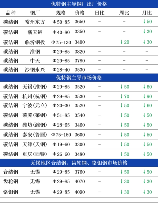 钢厂方面:今日常州东方优特钢出厂价格持稳运行,现45#碳结钢出厂3650元;杭钢优特钢日定价圆钢价格持稳运行,现45#碳结钢出厂3560元,以上均为含税价格;临沂钢投优特钢出厂格持稳运行,现45#碳结钢出厂3400元;天钢优特钢出厂价格持稳运行,现45#碳结钢出厂3350元。今日早盘南北优特钢日定价钢企出厂价格多持稳为主,因目前节前下游需求释放乏力,钢企端多随行出货为主,待假心态居多。