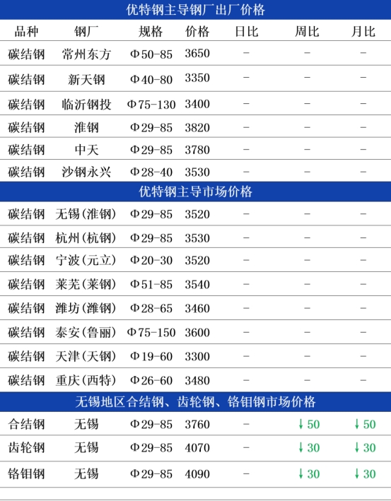 钢厂方面:今日常州东方优特钢出厂价格持稳运行,现45#碳结钢出厂3650元;杭钢优特钢日定价圆钢价格持稳运行,现45#碳结钢出厂3560元,以上均为含税价格;临沂钢投优特钢出厂格持稳运行,现45#碳结钢出厂3380元;天钢优特钢出厂价格持稳运行,现45#碳结钢出厂3350元。早盘国内日定价钢企多主稳运行,假期间各大生产企业无多变动,观望为主,午后或伴随出货情况调整今日出厂价格。