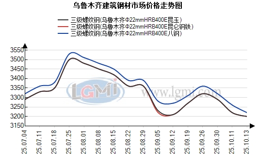 根据兰格钢铁云商平台监测数据显示,以乌鲁木齐为例,截至2025年10月13日,乌鲁木齐建材市场HRB400EΦ22mm螺纹钢八钢3220元较上一交易日下跌40元,昆仑钢铁3200元,昆玉3200元,闽新3200元,大安3150元,新安特3190元,和钢3160元,较上个交易日下跌20元;HPB300Φ8-10mm高线八钢3370元,较上个交易日下跌40元;HRB400EΦ8-10mm三级盘螺八钢3420元,较上个交易日下跌40元。