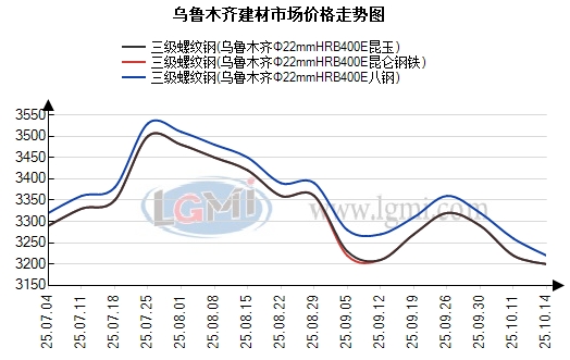 根据兰格钢铁云商平台监测数据显示,以乌鲁木齐为例,截至2025年10月14日,乌鲁木齐建材市场HRB400EΦ22mm螺纹钢八钢3220元较上一交易日持稳,昆仑钢铁3200元,昆玉3200元,闽新3200元,大安3150元,新安特3190元,和钢3160元,较上个交易日持稳;HPB300Φ8-10mm高线八钢3370元,较上个交易日持稳;HRB400EΦ8-10mm三级盘螺八钢3420元,较上个交易日持稳。