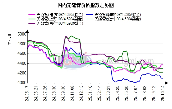 10月14日国内无缝管价格持稳运行,临沂钢投价格今日下调20元,现20#热轧管坯市场价格报3320元。据兰格云商平台监测数据显示,国内重点城市108*4.5价格为4425元,较上个交易日价格持稳,重点市场沧州报4150元、上海报4280元、无锡报4290元,近期,南北价差略有变化,沧州和江阴价差在70元,江阴较高;上海和山东价差在60元左右,上海较高。
