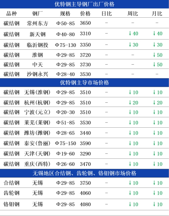 市场方面:近日黑色系期货盘面红绿不一,未进一步深弱但也没能强势反弹,对优特钢市场提振有限,关注盘中及后续能否有及时修复的机会。分地区来看,华东地区优特钢市场从锡杭等地了解,碳合结钢资源主流报价主稳,多地明价附近吆喝叫卖,轴承钢、铬钼钢资源主流亦是坚挺,同样是一边是有部分找货声凶狠压价,一边是弱稳报价也难有正面反馈,如此,买卖略显僵持,量价游荡继续博弈拉扯中。华北、华中地区优特钢稳中有弱,部分优价低位积极抢跑,部分企稳观望,若持续或难坚守,其中碳合结钢资源主流报窄幅调整10-20元,轴承钢、铬钼钢资源保持平稳,多地部分资源规格多以报价出售,无优惠空间。华南市场个别已破至低位以促成交。综上,优特钢市场以价换量意愿增强,奈何效果一般,外围有力支撑难觅,场内各方信心稍显不足,短时优特钢行情恐将继续灵活。