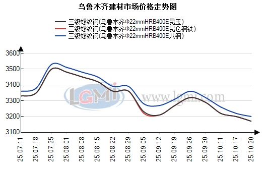 根据兰格钢铁云商平台监测数据显示,以乌鲁木齐为例,截至2025年10月20日,乌鲁木齐建材市场HRB400EΦ22mm螺纹钢八钢3200元较上一交易日下跌20元,昆仑钢铁3170元,昆玉3170元,闽新3170元,大安3120元,新安特3160元,和钢3130元,较上个交易日下跌30元;HPB300Φ8-10mm高线八钢3350元,较上个交易日下跌20元;HRB400EΦ8-10mm三级盘螺八钢3400元,较上个交易日下跌20元。