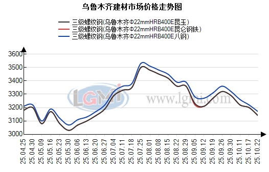 根据兰格钢铁云商平台监测数据显示,以乌鲁木齐为例,截至2025年10月22日,乌鲁木齐建材市场HRB400EΦ22mm螺纹钢八钢3170元,昆仑钢铁3140元,昆玉3140元,闽新3140元,大安3090元,新安特3130元,和钢3100元,较上个交易日下跌10元;HPB300Φ8-10mm高线八钢3320元,较上个交易日下跌10元;HRB400EΦ8-10mm三级盘螺八钢3370元,较上个交易日下跌10元。