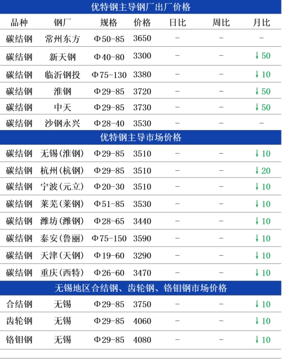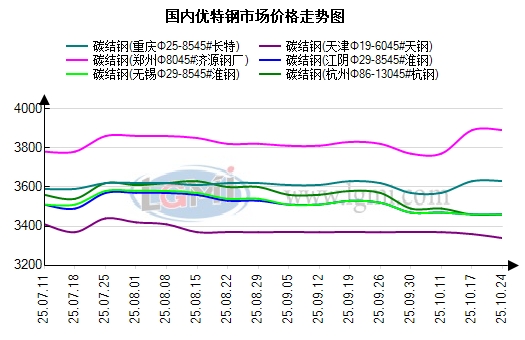 市场方面:目前黑色系期货窄幅上下波动,对优特钢市场提振效果有限,关注今日盘中动向,且看原料端期货能否站稳大关。现货方面,分地区来看,华东地区早间从锡杭等地了解,碳合结钢主流资源报价仍暂稳在上周五调整后的水准,代理商家更倾于借势刺激需求释放,但尚未有机会,其中轴承钢、铬钼钢资源主流报价依旧坚挺,多地明价吆喝叫卖,周末场内询价求购等吆喝较前两日明显活跃,商家期现同价一并叫卖,倒也能收获些许实单,但较理想还是有不小的差距,或会继续观望等待成交。华北、华中地区优特钢代理领衔观望,周末随着氛围暂稳片刻,目前碳合结钢资源主流报价持稳,轴承钢、齿轮钢资源窄幅调整,部分低位同样有所交投,部分稳高位则反馈一般,偏清淡。综上,目前优特钢市场暂无有效利好消息能得到提振成交的机会,在场各方商家都十分谨慎,毕竟流通困境依旧没有实质改善,短时优特钢市场还是会随行就市应对。