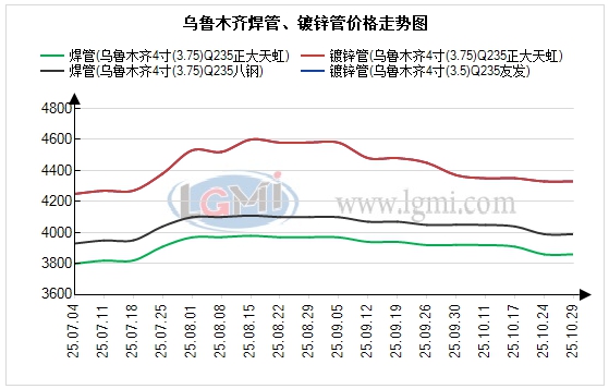 今日乌鲁木齐市场焊接钢管报价持稳运行,成交一般。兰格钢铁云商平台监测数据显示,截至2025年10月29日,乌鲁木齐市钢管价格:4寸(3.75)焊管过磅含税价:八钢报3990元,正大报3860元,比上一个交易日价格稳;4寸(3.75)镀锌管过磅含税价:友发报4330元,正大报4330元,唐山华岐报4310元,比上一个交易日价格稳。