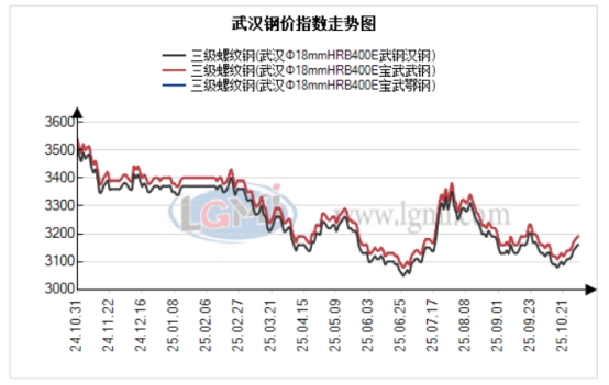 今日武汉建材现货价格持稳。据兰格钢铁研究中心监测显示:截至10月31日,武汉建材市场HRB400EΦ18mm螺纹钢宝武鄂钢3190元,宝武武钢3190元,武钢汉钢3160元。