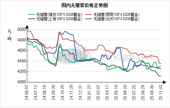 11月3日国内无缝管价格弱稳运行,临沂钢投价格今日价格下调10元,现20#热轧管坯市场价格报3350元。据兰格云商平台监测数据显示,国内重点城市108*4.5价格为4386元,较上个交易日价格持稳,重点市场沧州报4150元、上海报4280元、无锡报4290元,近期,南北价差略有变化,沧州和江阴价差在70元,江阴较高;上海和山东价差在60元左右,上海较高。