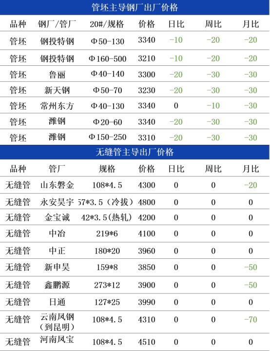 管坯:昨日全国管坯价格小幅下行,南北管坯价格均下调10元,目前市场情绪面较差,现货价格偏弱运行。跌价行情下,市场交投氛围不佳,下游投机需求减少,管坯出货不顺畅。考虑到当前钢厂利润持续收缩,但宏观利好出尽,行情最终回归到基本面,现货价格短期难以止跌,综合来看,预计今日管坯价格小幅下行。