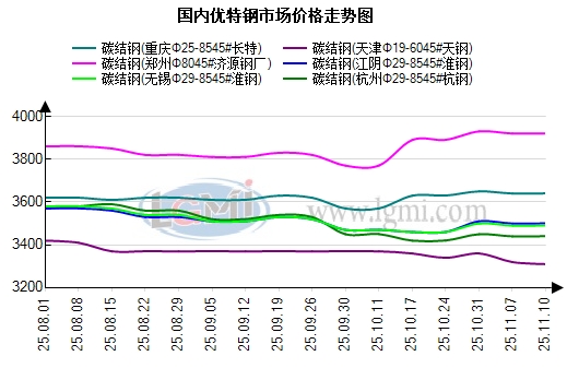 10日国内优特钢市场价格小幅下跌运行,据兰格钢铁云商平台监测数据显示,国内重点城市45#碳结钢85mm平均报价3609元,较上一交易日下跌3元;40Cr合结钢85mm平均报价3764,较上一交易日下跌3元,主要主导城市价格如下:Φ80-130mm45#杭州3510元;常州3440元;重庆3650元;天津3370元,以上主导城市较上一交易日窄幅调整10元。