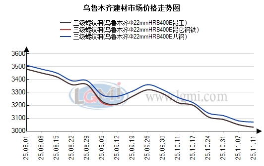 根据兰格钢铁云商平台监测数据显示,以乌鲁木齐为例,截至2025年11月11日,乌鲁木齐建材市场HRB400EΦ22mm螺纹钢八钢3070元,昆仑钢铁3030元,昆玉3030元,闽新3030元,大安3020元,新安特3010元,和钢3030元,较上个交易日持稳;HB300Φ8-10mm高线八钢3220元,较上个交易日持稳;HRB400EΦ8-10mm三级盘螺八钢3270元,较上个交易日持稳。