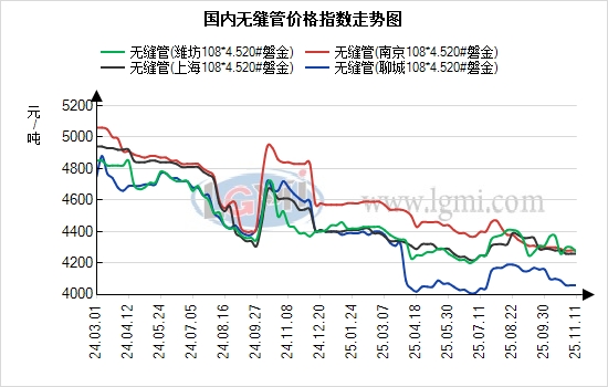 11月11日国内无缝管价格弱稳运行,临沂钢投价格今日价格持稳,现20#热轧管坯市场价格报3330元。据兰格云商平台监测数据显示,国内重点城市108*4.5价格为4380元,较上个交易日价格持平,重点市场沧州报4150元、上海报4280元、无锡报4290元,近期,南北价差略有变化,沧州和江阴价差在70元,江阴较高;上海和山东价差在60元左右,上海较高。